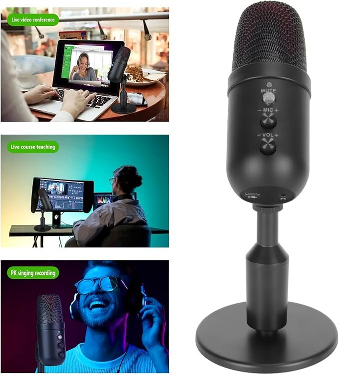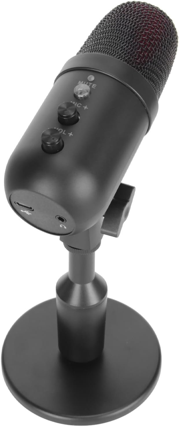 Microphone USB MU1000 : Bouton de gain pour ajuster la sensibilité, qualité sonore supérieure avec mode cardioïde pour réduire le bruit de fond, compatibilité plug-and-play, monitoring en direct via un port 3,5 mm et rotation à 360° pour plus de flexibilité. Idéal pour podcasts, enregistrements et réunions en ligne.